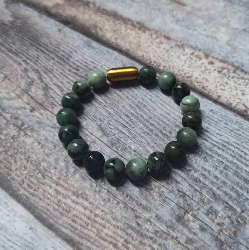 Hand-selected for their rich green hue and unique organic patterns, each emerald stone in this bracelet represents emotional healing, mental clarity, and heart chakra alignment. The dynamic color shifts between deep forest and vibrant jade tones, catching light beautifully while reflecting the calming strength of nature.