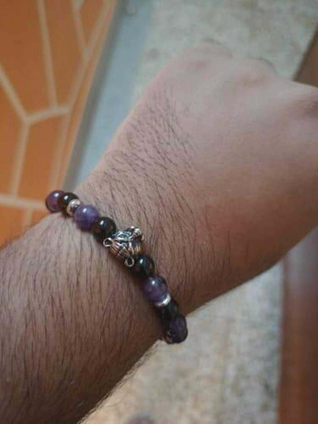 - Made up to gloss onyx and amethyst stones with a panther charm in the centre this bracelet has various healing properties
